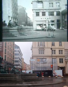 Großer Platz am Neuen Markt und Donnerbrunnen: Die Frau kommt aus dem Hintergrund der Kamera entgegen, es folgt ein kurzer Bewegungssprung der Dame. Sie geht von rechts nach links um das Denkmal herum. Ein Radfahrer huscht durchs Bild. Im Hintergrund sehen wir weiße Häuser. Das Bild kämpft mit der Schärfeneinstellung und wird kurzzeitig und rhythmisch diffus. (2.45-2.54)